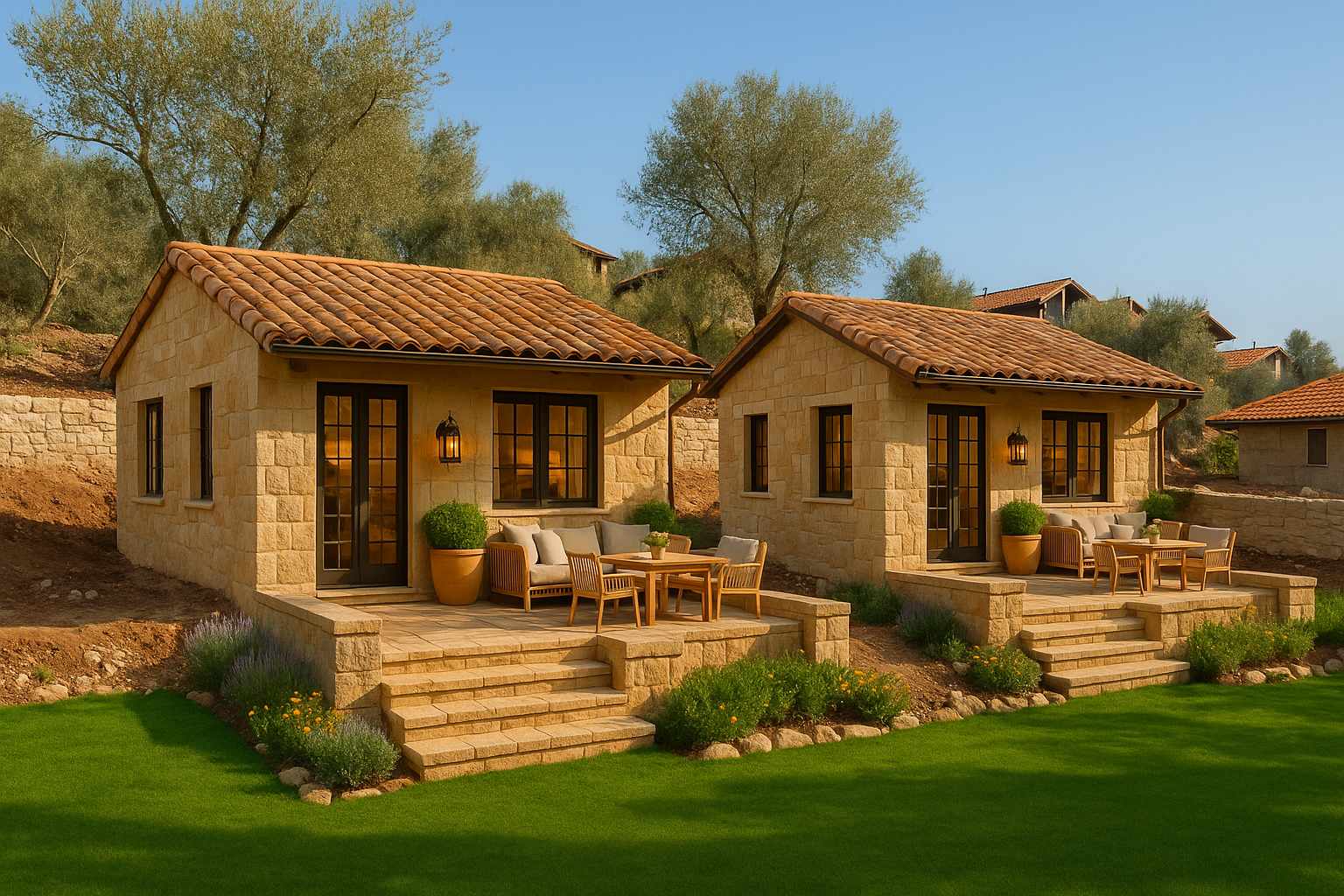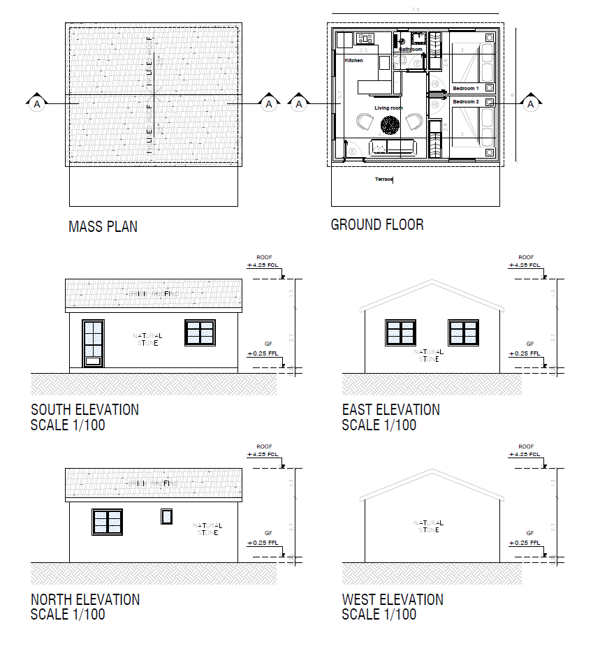 - Footprint: approx. 7.5 × 8 m (≈75 m² including shared)
